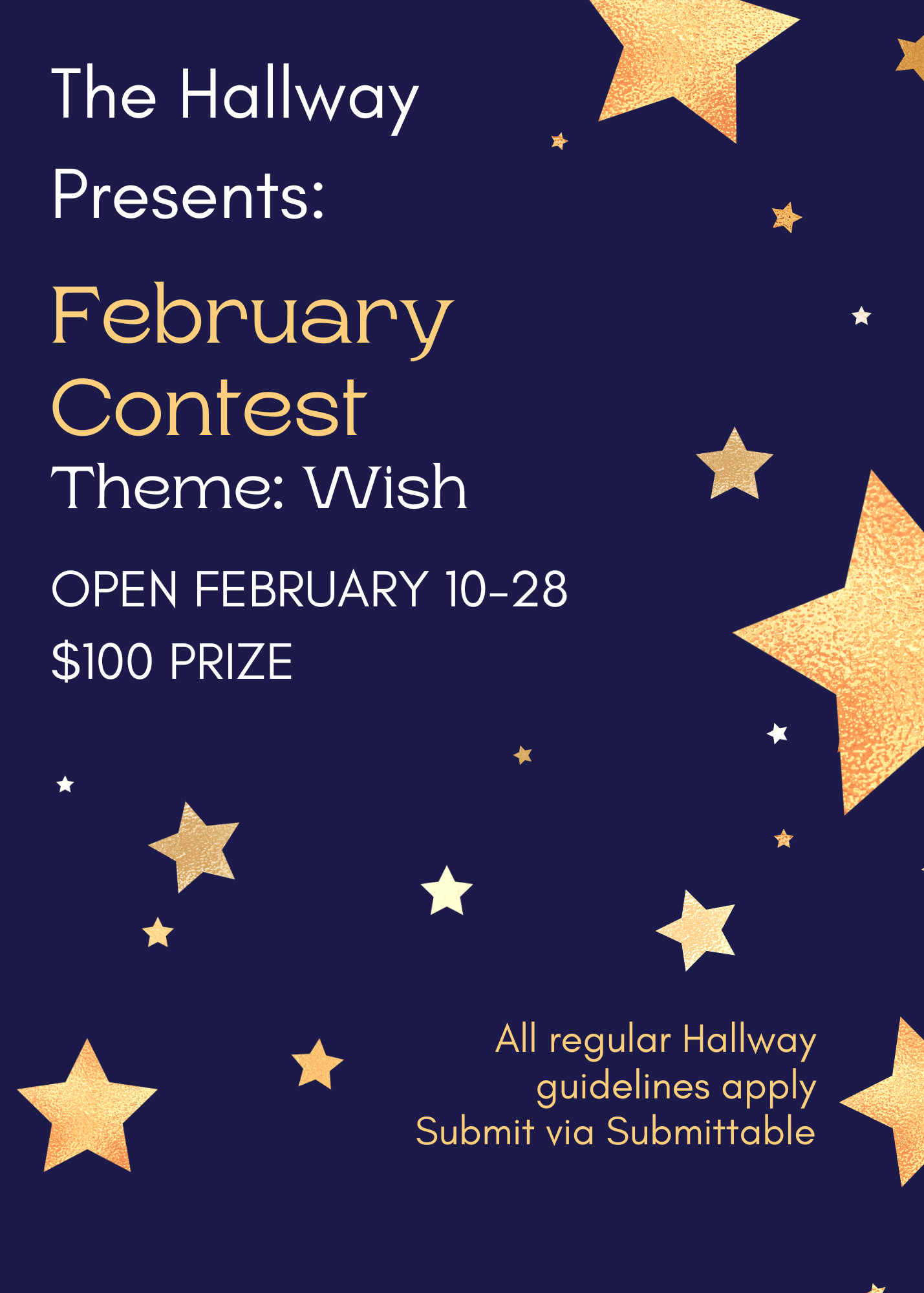 The Hallway is holding its first contest! Themed around the word "wish", we're accepting submissions February 10-28 with a $100 prize. Our judges are The Hallway editors Tenley Cederholm and Kate Meen.